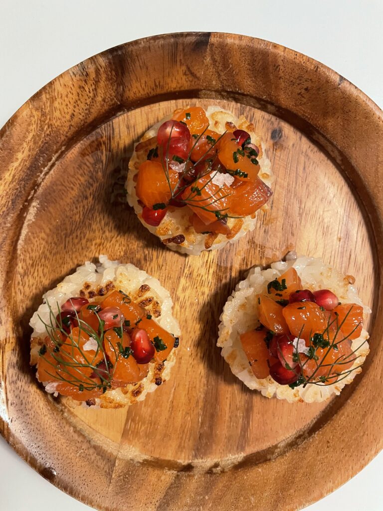 Shallow fry the rice cakes in hot oil until golden. Finely slice the chives, mix through the cured salmon and spoon on top of the rice cakes.